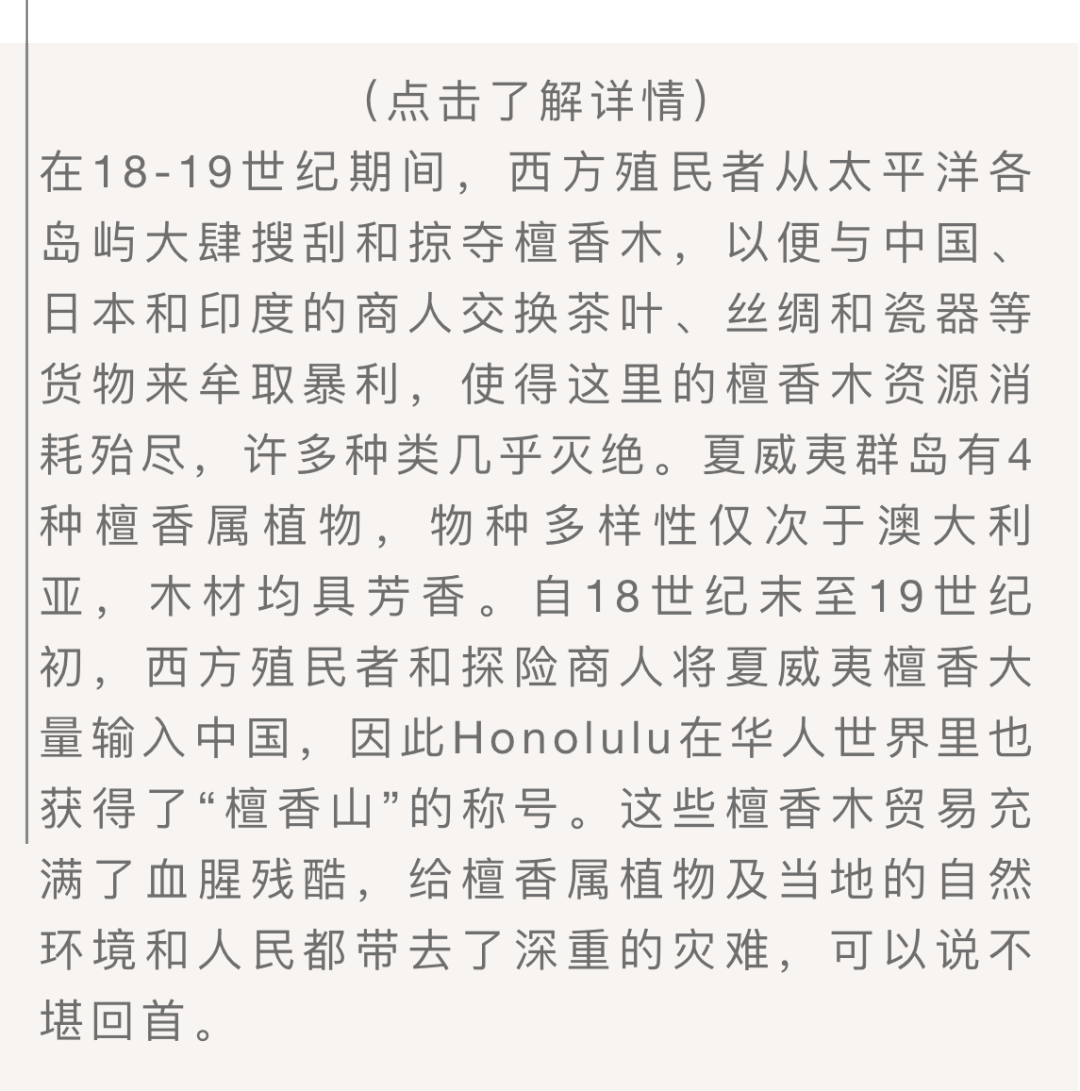 上乘的檀香木需百年成材,六十年以上剛能稱為老樹,一般砍伐后還要放置三十至四十年,木性才能真正達(dá)到醇化,氣味達(dá)到沉穩(wěn)溫和。但誰又能等到那么久呢,現(xiàn)在市面上能看見樹齡在三十年以上的檀香木已經(jīng)很少,更別提醇化的時間。大量千百年才積累的檀香木在幾年間要么被制作成工藝品,要么化作一縷縷輕煙飄散,地球上天然的檀香資源幾乎已經(jīng)消耗殆盡。