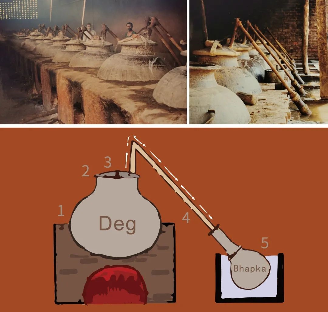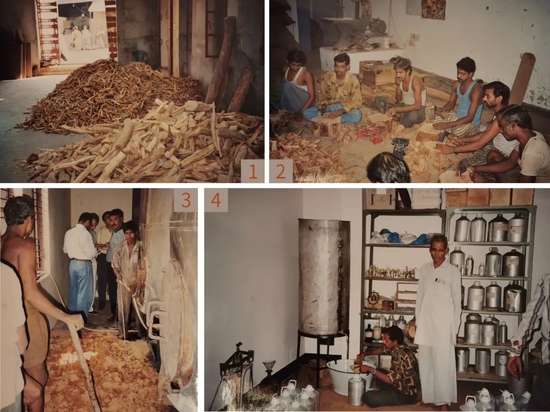 印度極富盛名的傳統(tǒng)檀香精油產(chǎn)品是Attar(Ittar)。Attar的生產(chǎn)工藝,即Deg 和Bhapka流程,非常獨(dú)特。一個裝置通常包括一個較大的可以直接加熱的銅罐(即Deg),用1-2個通常是竹子做的彎管連接到另一個較小的,里面盛著檀香精油銅罐(即Bhapka),這個小銅罐(Bhapka)放置于冷水池中進(jìn)行冷卻。生產(chǎn)時,在Deg中按照配方放入水和不同的原料,如鮮花、香草料、香辛料、焙過的泥土等原料,連接并密封Deg和Bhapka及彎管后,直接用明火加熱Deg進(jìn)行蒸餾,餾出的香氣成分經(jīng)過竹管后進(jìn)入Bhapka,經(jīng)過冷水冷卻后,直接被Bhapka中的檀香精油吸收。蒸餾結(jié)束后,吸收了餾出香氣的檀香精油再經(jīng)過多年的陳化就完成了成品Attar。與調(diào)香師調(diào)香一樣,Deg中原料的配方和比例就是調(diào)香的秘密,決定了最終Attar的香氣特征。用玫瑰花瓣這樣生產(chǎn)出來的Attar就叫玫瑰Attar。